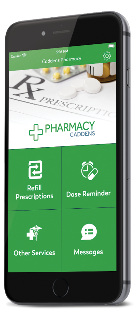 Once you download the Refill Assistant app, you will be asked to enter a 7-digital pharmacy code. Our code is ”4573794”. Select ”Caddens Pharmacy”. Enter a 4-digit PIN number that you will remember, your contact and caregiver/doctor details. Please ALLOW the app to send Notifications. That is it you are ready to go.